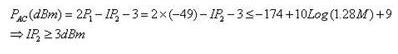 3GPP规定TD-SCDMA终端当存在两个干扰信号,一个为调制类型的干扰信号,在±6.4MHz处,电平为-46dBm,另一个为点频类型干扰信号,在±3.2MHz处,电平为-46dBm,系统灵敏度可下降3dB。如果我们认为灵敏度下降是因为互调产物所导致的,只要该产物功率不大于灵敏度电平时的带内总噪声功率,则该指标就没有问题。假定接收通道噪声系数为标准所要求的最低指标:9dB,由此我们可以推出该指标所要求的等效三阶截止点,该三阶截止点与输入干扰信号的频率偏移量有关,因为接收通道包括信道选择滤波器。