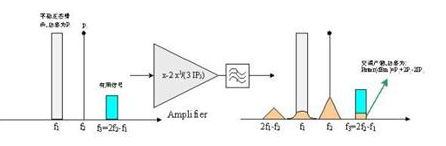 c)双音互调指标。无论是零中频接收机还是超外差接收机都会面临双音互调干扰问题。影响该指标的主要是混频器及前面各级有源器件,混频器后面电路因有信道滤波器的原故,对此指标影响不大。图5是双音互调指标的干扰示意图。