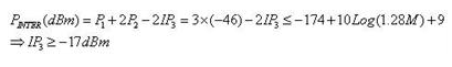 通过上面的讨论我们得到两个射频通道指标:IP2和IP3,关于IP3,下面所要讨论的双音互调指标会有更高要求。方程5给出阻塞指标所要求的IP2应大于3dBm,图一参考设计在该指标上有很大余量。