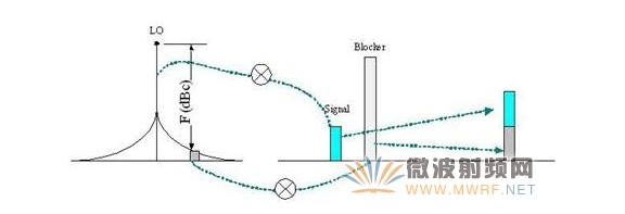 阻塞指标、双音互调指标对系统的影响有一个途径就是倒易混频,图7是一个倒易混频的干扰示意图: