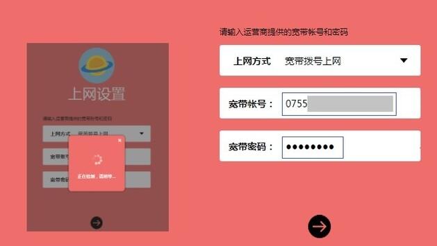 第四步:成功登陆后,路由器将自动识别当前上网方式,家用宽带直接输入宽带账号和宽带密码即可(一般在宽带报装单上标明)。