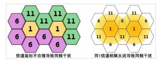 在无线WiFi覆盖工程中,为了减少信号盲区,不得不部署多个AP来完成无线覆盖的重叠区域。要注意合理的规划和使用无线信道,相邻的AP按1、6、11相互隔开。左边图同频干扰严重,右边图改善一些,无线信号重叠部分会导致轻频干扰。