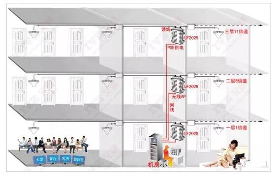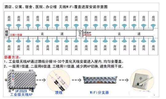 对于大中型无线WiFi覆盖工程,建议使用天馈式覆盖方式,工业级无线AP通过馈线分接4-8个天线安装在走道,穿透覆盖两边的房间。天馈式WiFi是专业的覆盖方式,移动和电信覆盖火车站、酒店、写字楼通常采用这种方式。天馈式覆盖可以做到一层楼或整栋楼使用一个AP,这样便于无线信道的优化,一层用1信道,二层用6信道,三楼用11信道,避免同频干扰。用户走过来走过去,都是在同一个AP下,可以减少跨AP切换,真正做到的无缝漫游。