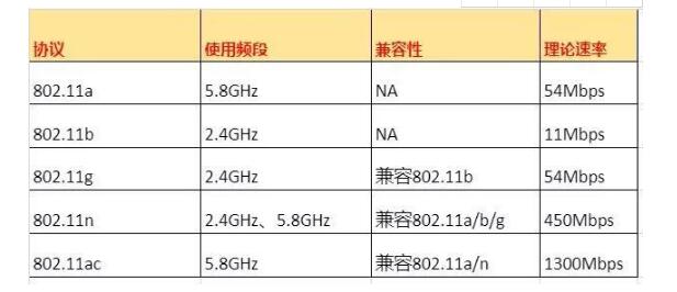 802.11是无线局网的一个标准协议,由它发展出来的一系列协议都代表着不同的工作频段和传输速率。整理个表格如下(这里的理论速率差不多是实际速率的2倍)