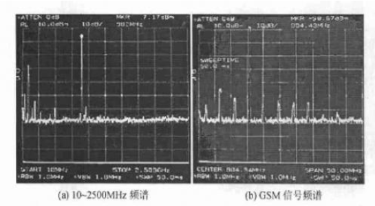 (a)10-2500MHz频谱 (b)GSM信号频谱