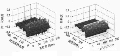 算法的计算结果见图3,图3(a)中的尖峰是GSM所产生的随机性射频干扰,显然,干扰的分布是随机的,图3(b)是中值滤波的结果,图中这种随机的RFI已经被消除。