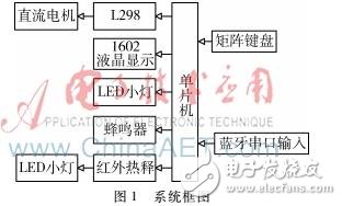 此控制系统由STC89C52、蓝牙串口电路、电机驱动电路、矩阵键盘电路、LCD1602液晶显示模块、红外热释电模块和报警电路组成,系统框图如图1。