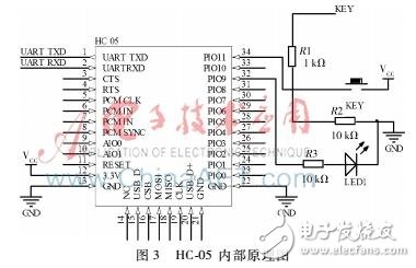 图2中GND表示单片机和HC-05系统的参考地,TXD是串行发送引脚,RXD是串行接收引脚。HC05和单片机之间通信,为保证电源基准相同,故将单片机的GND与HC-05的GND连接起来。其次为构建通信通道,将单片机的接收引脚与HC05的发送引脚连接起来,作为单片机的接收通道;将图2蓝牙接线示意图单片机的发送引脚和HC-05的接收引脚连接起来,作为单片机的发送通道。HC05蓝牙串口电路原理图如图3。