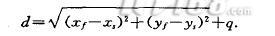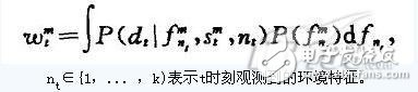 t 时刻机器人到某一路标的距离d是路标坐标f i ( x f i ,y f i )与机器人位置坐标st ( x s ,ys )的函数,f i ( x f i ,y f i )表示第i个路标的实际位置。模型中的噪声用q表示。观测模型可以表示为:
