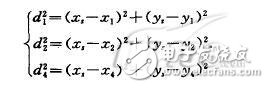 在定位算法中,信息标签对未知阅读器的位置都有影响力,标签到阅读器的距离越近,其影响力越大,对阅读器位置有更大决定权。本文中的阅读器放在移动机器人底部.所以阅读器的位置也是机器人的位置。如图2,阅读器收到了4个信息标签的信号,4个标签的坐标分别为( x1,y1),(x2,y2),( x3,y3),( x4,y4),它们到移动机器人的距离分别为d1 ,d2,d3,d4。可以看出d1《d2 《d4 《 d3。