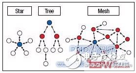 ZigBee网络的实施有三种拓扑,如图3所示。与802.15.4类似,ZigBee支持对等通信与星型配置。ZigBee在802.15.4规范之上添加了路由协议与层级网络寻址方案,可实现群集树拓扑结构(具有相同PAN ID)以及多跳网状网络拓扑。