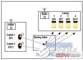 不过,应用级抽象可能是ZigBee最具有竞争力的特性。可以对每个节点进行汇编以容纳多达270个“端点”或者应用。举例来说,每个端点都可以代表一个电灯开关或者一个灯泡(灯泡01、灯泡02等)。每个端点可以接受任意类型的数据,也可以发送任意类型的数据。从某端点输出到另一端点的输入数据有单个描述符,一般称为群集(Cluster)。为继续使用灯泡作为例子,假定被命名为“light_status_on_off”的灯泡开关状态是这些称为群集的数据描述符之一。然后,每个端点就可以根据端点ID(1-270)及其群集列表(接收或者传输的数据类型)进行描述。在群集匹配的情况下,就可以进行一对一或者一对多端点的逻辑绑定。在该例中,某一灯泡开关可以与任一或者所有被描述为支持“light_status_on_off”群集的灯泡逻辑绑定。这种应用级的一对一或者一对多绑定是ZigBee协议功能强大的特性。