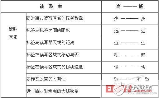 读取率是指若干标签通过读写区域后能够被正确读出的数量和通过的标签总数量的比率,漏读率就是没有被读出的数量和总数量的比率。这个指标也是受多种条件限制的,笼统地说读取率是多少是没有意义的,甚至连参考价值都没有,因为它受更多不确定因素的影响。它除了和上述关于读写距离的影响因素有关外,还与同时有多少个标签通过、标签与标签之间的相对位置、标签与读写器天线之间的距离、标签与读写器天线之间的相对移动速度等因素有关。当然,读写器和标签的性能是基础,但一旦选定,它们是确定的。