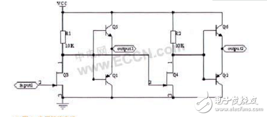 基于LabView平台由计算机提供给射频开关的电压控制信号是数字信号,极高电平为5V,低电平为0V,而射频开关需要的电压控制信号是10V,因此需要把5V转换为10V,图1为转换电路图。当输入信号input1为5V时,Q3导通,Q5截止,Q1导通,所以output1为0V。这时Q4截止,Q6导通,Q2截止,output2输出VCC为10V。最终,使得当LabView提供5V电压时,输入到开关的电压为10V和0V;而当输入信号input1为0V时,Q3截止,Q5导通,Q1截止,所以output1为10V。此时Q4导通,Q6截止,Q2导通,output2输出为0V,输入到开关的电压为0V和10V。满足微波射频开关的工作电压。