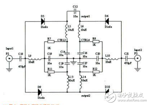 在本电路中二极管用的是INFINEON technologies公司的BA592,导通的最佳性能电流是5mA。所以满足二极管的要求在设计中加入的控制电压是10V,回路电阻R7、R8、R11、R12的大小均为10K。