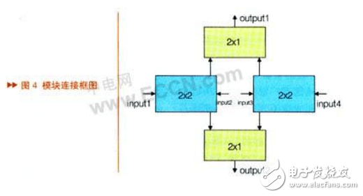 图4是整个电路的模块连接框图,清晰地表示了模块之间的逻辑关系,以及信号的传输过程。例如当控制逻辑为1111时,输入信号input1和input3通过二极管从上面的通路输入2x1输出模块,由于控制逻辑为高,只有input1可以从output1输出;而输入信号input2和input4通过二极管从下面的通路输入下方的2x1输出模块,同样由于控制逻辑为高,只有input2可以从output1输出,这样就实现了四路输入信号只有input1和input2分别从output1和output2输出。当改变控制逻辑时,就可以选择想要的输入信号的输出。例如控制逻辑如果为1110,则输出信号为input1和input4。4路控制信号可以控制12种状态,对应地建立起数据库,通过LabView编写相应的程序应用到测试中。