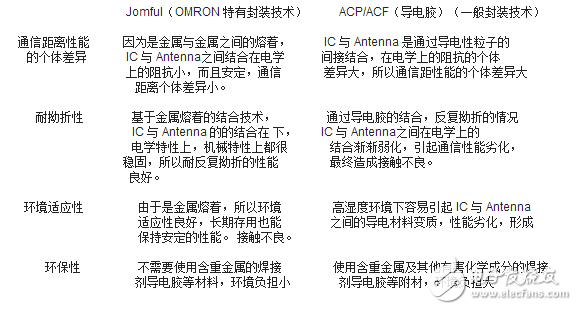 一个完整的 Inlay(未封装的 RFID 标签)是由 IC 组件和天线部分压焊而成的,具体而言,JOMFUL 技术就是在 Inlay 的压焊过程中,第一步,通过超声波压力振荡使 IC 金脚磨削热可塑冷凝材料层,使之被熔融穿透,并使 IC 金脚直达天线铝质基材层;第二步,继续施加超声波压力振荡,使 IC 金脚与铝制基材互相熔融嵌合;第三步,去除超声波压力,此时,在第一步骤中熔融的热可塑层将随之固化,起到固定 IC 的作用,IC 与金属天线之间也完全冷凝融合。