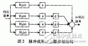 假设FIR滤波器传递函数为H(z),根据十进制/插补理论[2],通过如图2所示对H(z)的多相分解(在图中设M=4),能更有效地完成过采样及滤波器功能。在图2中,Hk(z)表示子滤波器的传递函数,其脉冲响应hk(n)=h(4n+k), n=0,1,…11是由对h(n)抽值得出的。多相结构的优点在于:单个子滤波器是工作在较低的抽样速率上的,而将4个子滤波器相结合后,其系数总值与原来滤波器的H(z)系数相当。也就是说,采用这个方法,整体的计算总量能减少3/4。同时从图2可以看出,这种方法需要用到4个滤波器,因此就硬件的有效性来说,这并不是最理想的。