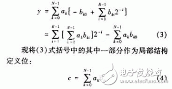 由于bki取值只有0或1, 则(4)式的值有2N种可能性。因此,可以预先算出这2N个局部结果并存放在一个固定的表中(表的宽度为对系数ak定义的宽度,深度为2N),N是能够对数据源抽样数据进行处理的数据长度[3]。然后按照输入的数据,直接对该表寻址并将结果导入累加器中。在B-1次查表之后,累加器的寄存器存储有(3)式第一项所示的结果。最后一个查表给出局部结果