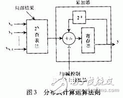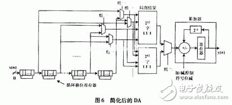 DA运算法则如图3所示。所需的基础操作有:查表排序、加法、减法以及输入数据序列的移位。运用DA结构的前提是:输入抽样值必须要表示为2个补码并将其转换成一个比特串行形式。总共需要有N个B比特的移位寄存器,每个寄存器在一个时钟周期下产生1比特来生成一个用于查找表(LUT)地址(N比特宽)。LUT存储了所有滤波器系数状态可能的局部结果,这些局部结果在寄存器中进行加权(每个周期除以2)和累加,直到每个移位寄存器的最后一位为止。