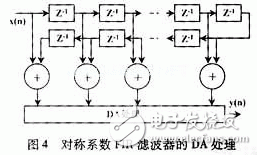 由于脉冲成形滤波器有着对称的冲击响应,因此先把使用同一个脉冲响应系数的2个输入取样值进行相加,然后相继地把N/2个加法器的输出结果送入DA进行处理,如图4[4]所示。所以,LUT的个数也就从2N个减少到了2N/2个。