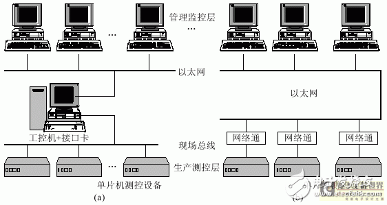 在工厂、变电站、智能大厦等大型企业自动化系统中,如 图1(a) 所示,在上层企业管理层和生产 监控层采用的都是以太网和PC机,而在下层车间、现场都是采用现场总线(如RS-485、CAN、 lonWorks、基金会等)和单片机测控设备。上下两层的沟通,通常采用工业控制机加以太网卡,再加 上PC机插槽上的接口卡或并行打印口的EPP接口卡来实现。这种连接方式成本高,开发周期长,接 口卡成为系统上下两层的通信瓶颈,一旦出现故障,上下两层的联系就告中断。为此,如 图1(b) 所 示,我们利用廉价的“网络通”组成基于单片机的以太网-CAN网关取代昂贵的工控机加接口卡,成 功地实现了以太网和现有CAN总线网的直接连接,实现管理监控层(以太网)和生产测控层(CAN总 线网)之间的连接。上下层数据能方便地进行交流。