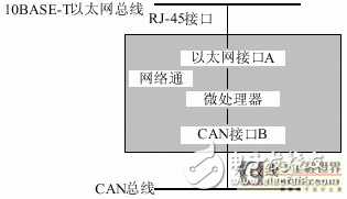 在网络控制系统中,我们利用“网络通”组成基于单片机的以太网-CAN网关,结构组成如 图 2 所 示。“网络通”由以太网接口A和微处理器组成。在此基础上增加CAN接口B就组成了以太网-CAN 网关。
