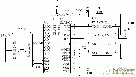 由于CAN总线传输的数据量不大,数据传输速率不高,远小于以太网的数据传输速率,所以在以太网 -CAN接口模块中,数据的传送瓶颈在CAN接口B。在测控领域,通常传输的数据量不大,对数据传输 速率要求也不高,于是,在此模块中微处理器可选用通常的单片机如 8031等。