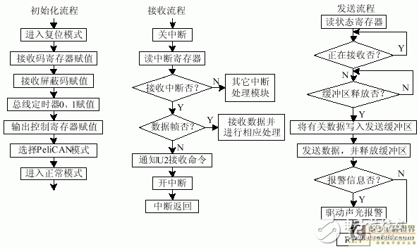 图 4 是微处理器对SJA1000进行初始化、读、写的流程图。微处理器将 以太网送来的命令通过向SJA1000写,来传送给CAN测控设备;反过来,又将向SJA1000读取CAN 测控设备的测量值或状态,通过以太网发送出去。