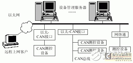 在以太网上,所有的CAN测控节点组成一个虚拟网段。CAN设备管理服务器是企业以太网中的任一控制节点,连在以太网上的WIN NT服务器安装专用网络管理软件就可让合法的工程技术人员远程管理CAN设备,通过以太网可同CAN设备进行数据通信。这样以太网就可完全替代原来的CAN总线网,同时,服务器使用WEB发布方式向网络客户提供动态交互式浏览网页。