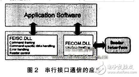 本文使用两种方法与阅读器通信。一种是客户端计算机上带有$6500阅读器的应用软件通过连接本地动态链接库来通信。TI提供程序库feisc.dll和fecom.du。如图2。