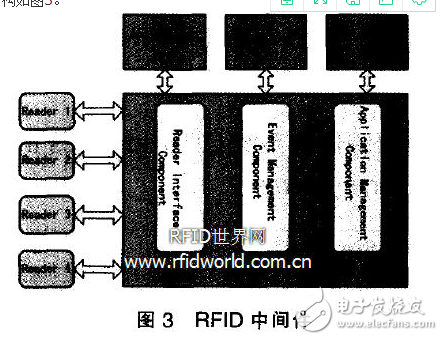 另一种是安装一个用于连接阅读器和客户端应用程序的RFID中间件。上述动态链接库文件(fecom.dll和feisc.du)用Microsoft基础类写。使用Java,采用调用本地链接库的方法,用VisualC++并依据Java本地接口(JNI)的标准设计中间件。RFID中间件基于三个部分:阅读界面组件,事件管理组件,应用程序管理的组成部分。结构如图3。