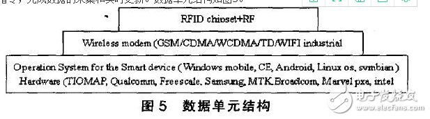 通过这3个单元,将RFID智能设备整合在智能终端上。其中可以选择的平台包括WindowsMobile,WindowsPocketPC(windowsCE),AndroidOS,LinuxOS。智能设备将按照系统管理中心提供的数据指令,完成数据的采集和实时更新。数据单元结构如图5。
