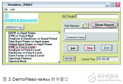 (3)外部PC软件DemoMeas_WiMAX:通过 GPIB 或 LAN 控制信号源(SMU200和SMJ100) 和频谱仪(FSQ和FSL) 。如图3所示,用户只需在左边栏目选择待测的参数,软件可自动完成测试所需的设置,而且同时生成测试报告。