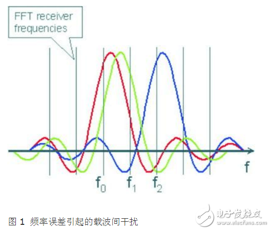 (5) 频率误差:频率误差可以用相对于频谱仪中心频率的载波频率误差来描述。收发信机间的频率误差将引起各个子载波频谱相对于接收机FFT频率的移动,产生载波间干扰(ICI),如图1所示。