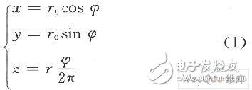 在柱坐标中,螺旋线位于半径为r0的支撑杆表面上,螺旋线可以定义为: