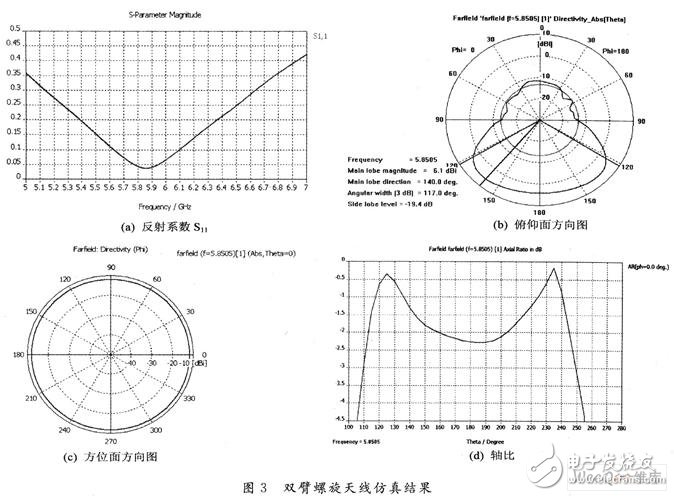 双臂螺旋天线模型仿真结果如图3所示。在设计中,为了尽可能使电流在螺旋线末端近乎为零,使所有能量辐射出去,同时折衷结构的尺寸要求,需优化出双臂螺旋天线基本尺寸,如螺旋线半径、介质杆半径、螺旋半径、螺距和螺旋圈数以及平衡器开槽深度0.25λ。计算结果表明,当圈数适当时这种双臂螺旋天线的尾瓣很小,具有宽的方向图,波束宽度能够达到11O°以上,在波束宽度内轴比小于3 dB,方位面为全向辐射,而且增益能够达到6.1 dB,具有良好的匹配性能。