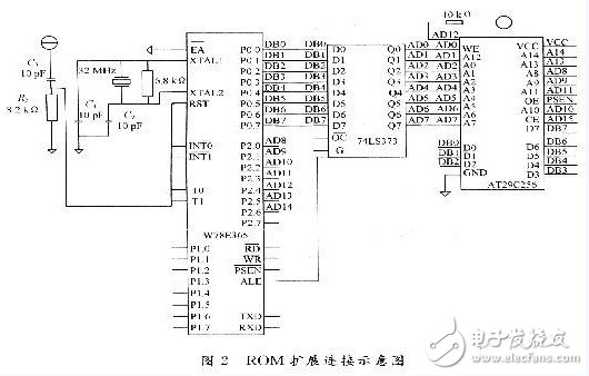 W78E365内部ROM仅64 KB,内存太小,故采用AT29C256作为外扩ROM。线路连接见图2。