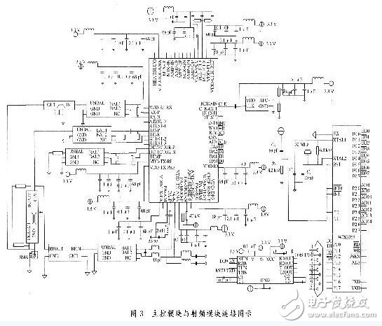 R1000与W78E365的连接见图3。射频信号经天线进入电桥,输出信号被分为两路,一路信号经过带通滤波器和不平衡到平衡的转换进入R1000的射频输入口。另一路信号经不平衡到平衡的转换进人R1000的本振输入口。这两路信号在R1000内部经过解调和模/数转换等一系列操作后,将所得的数字信息送给W78E365。W78E365对收到的信号经解码和校验,将所得信息送往上位机,并将其对R1000的命令编码和加密后发送给R1000。这些命令在R1000内部经过调制和PA,再经过平衡到不平衡的转换和滤波,由天线发射出去。数字模块中的时钟驱动来自于外部TCXO产生的24 MHz参考频率。系统中通过∑-△DACS的信号频率为24 MHz;通过∑-△ADCS的信号频率为48 MHz。