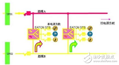 ---- 对于单输入负载,将双母线上的电力经过STS自动电子转换开关,转变成单路的电源,再向负载提供精密供电。STS完成的功能是当一路输入电力故障时,STS能够在6ms内切换到另一路输入上,保障关键设备不间断运行。