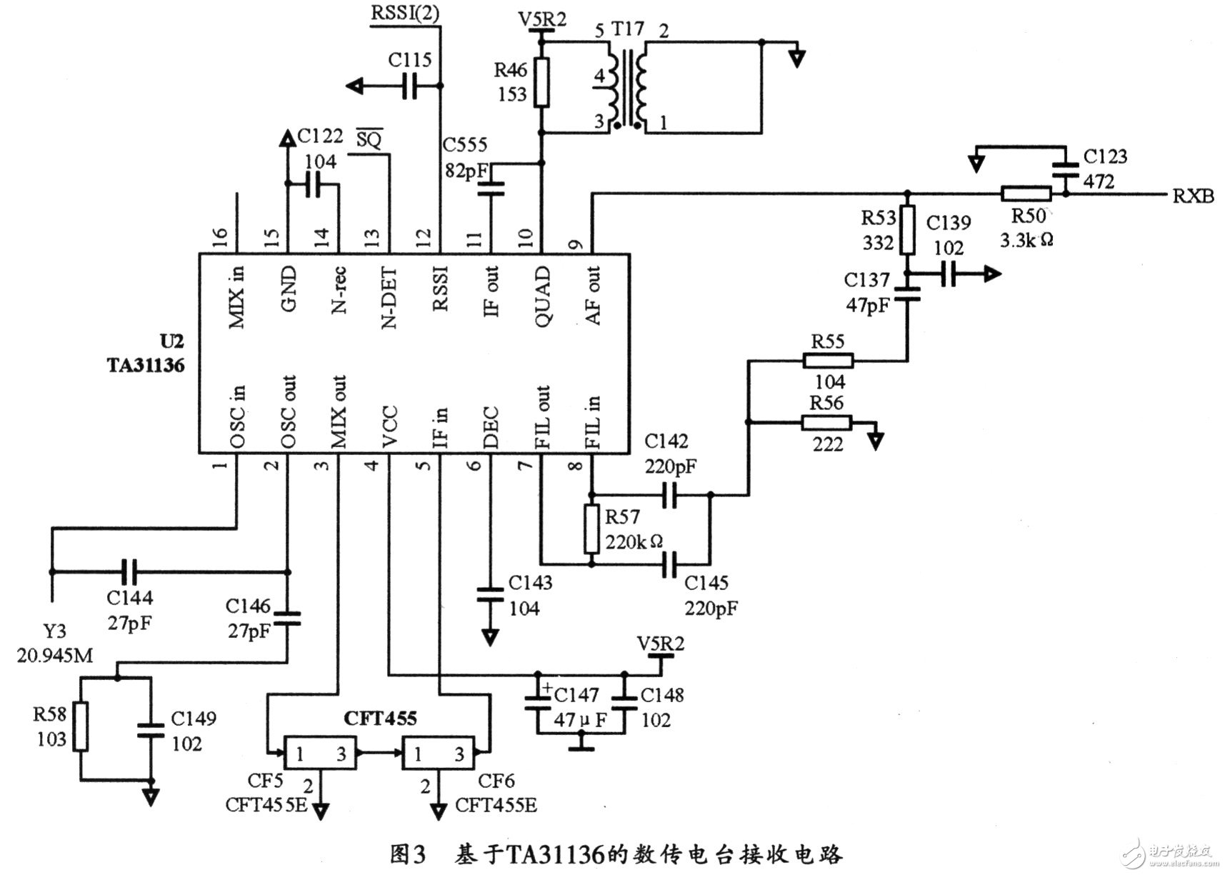 图3所示是TA31136在本接收机中的应用电路图,该电路的Vcc采用5 V供电。接收信号经过第一次变频后变为21.7 MHz,然后经过两个21.7 MHz的晶体滤波器,来增强对输入信号的选择性。T10为谐振频率21.7 MHz的中周,与三极管Q2组成选频放大器。VCC2为5 V,可给三极管提供偏置电压。U3 (TA31136)将16脚输入的21.7 MHz的信号与1脚的本振信号21.245 MHz进行混频,以形成二中频455 kHz。再经中频放大,从455 kHz鉴频中周出来的解调信号经过由内部电阻R64和外部电容C116组成的低通滤波器,滤去中频及高次谐波后进入低放电路。本方案在10脚和11脚出来的鉴频部分之前用的是中周,结果发现中周线圈很难调试,后来改用村田制作所的陶瓷鉴频器CDB450C24。因为CDB450C24结构简单,容易实现,频率精确正负1%,带宽10 kHz左右,而且不需要负载电容。