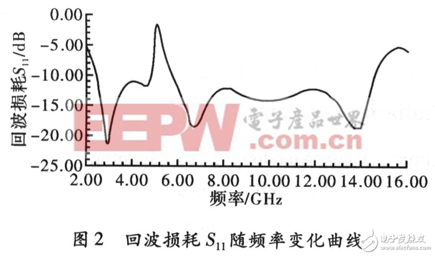 为了抑制WLAN系统的干扰,通过在辐射金属片上加入矩形调谐支节,从而使天线具有陷波特性。由于辐射单元的电流主要沿着贴片边缘分布,而接地板的电流则集中分布在接地板的上边缘,所以在距离辐射贴片底边1 mm处开宽矩形缝隙,并加入调谐支节。天线回波损耗随频率变化的仿真结果,如图2所示,可以看出,天线在2.49~14.53 GHz范围内回波损耗S11≤-10 dB,但在4.9~5.92 GHz频段时天线回波损耗S11》-10 dB,这表明该天线具有带阻特性,从而减少了系统间的干扰。