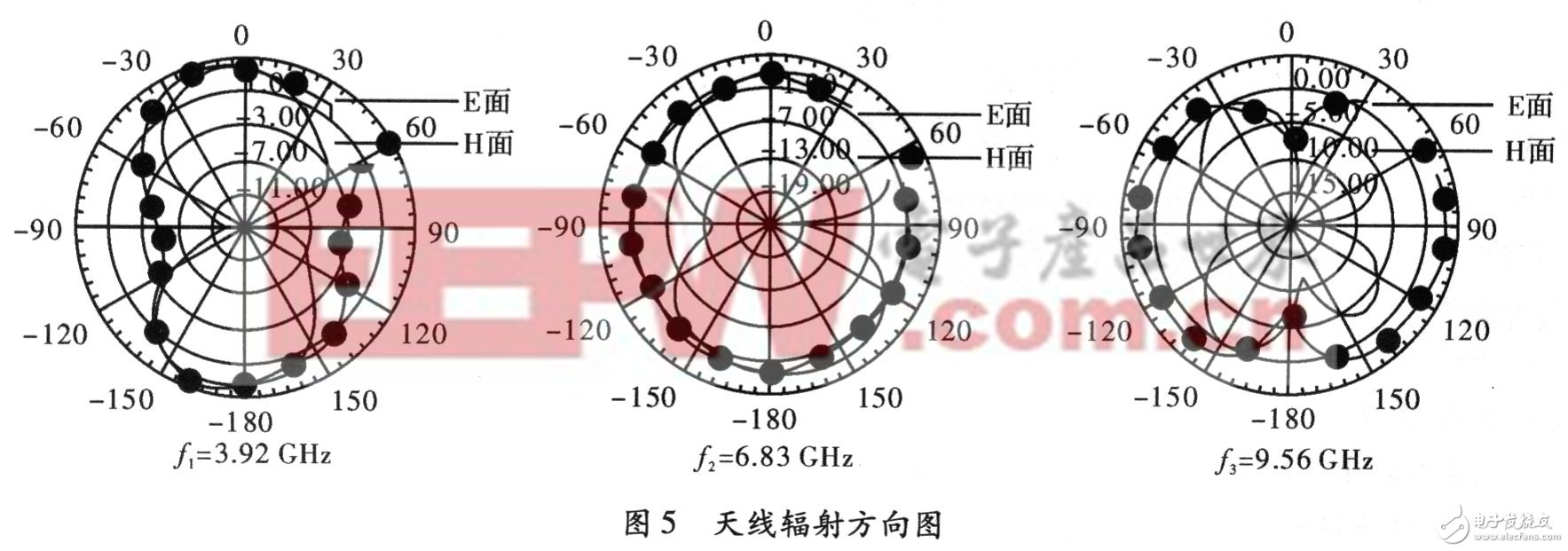 由于超宽带通信技术的实际使用,要求天线在一个平面上具有全向的辐射特性,阻抗带宽并不一定就是方向图带宽。所以,文中对天线的辐射方向图进行了仿真分析。图5给出了天线在f1=3.92 GHz,f2=6.83 GHz,f3=9.56 GHz的E面,H面的辐射方向图。由图可以看出,由于调谐支节的加入,在高频端E面的方向图有所畸变,但在在整个工作频带内还是比较稳定的。而H面方向图在要求的3.1~10.6 GHz频段内几乎是全向性的,并且几乎没有出现旁瓣,结果表明该天线在超宽带通信的工作频带内具有较稳定的方向图。