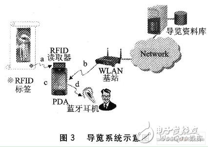 在每个欲提供导览服务的展览对象附近放置RFID标签,并建立WLAN基站,使WLAN基站信号能涵盖参观者所有可能的活动范围。WLAN基站连至有线网络,有线网络架有一台Web服务器作为导览网站,所有的导览内容将被制成网页放于此网站,每个导览项目对应一个唯一的网址。另外必须记录所有RFID标签的标识符与展览对象对应,利用此对应数据,网站中网页转向(redi—rect)程序可依据由导览PDA所传来的RFID标签标识符提供正确的导览内容。图3显示所规划的导览系统示意图,其本过程是:a.RFID读取器读取标签ID;b.PDA经由WLA至Web服务器读取导览内容;c.PDA显示导览内容;d.利用蓝牙技术将导览声音解说传输至蓝牙耳机。