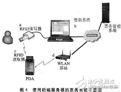 RFID在票务系统的应用,有别于导览系统。用户持有RFID标签取代传统门票,而RFID读取器则用来验证门票。因此,票务系统设计重点在于如何利用RFID标签作为校史馆的门票以及如何有效验证门票合法性。通常校史馆的门票可依据参观者身份、年龄或依参观项目或场次提供不同票价门票,使用RFID标签取代传统的门票也应能够提供相同的功能。一般RFID标签都有一个独一无二且不能被拷贝、篡改的ID标识符,可以辨别合法的RFID标识符以达到基本的门票验证功能。有两种记录RFID门票方式:记录于票务系统服务器数据库,储存于RFID卷标本身的内存。图4显示第一种记录售票内容方式的票务系统示意图,基本过程是:a.参观者购票,RFID读取器读取RFID标签ID;b.售票系统存储售票内容至票务管理系统;c.参观者持RFID门票参观,馆务人员持RFID读取器读取RFID标签ID;d.PDA利用WLAN至票务管理系统读取门票内容。