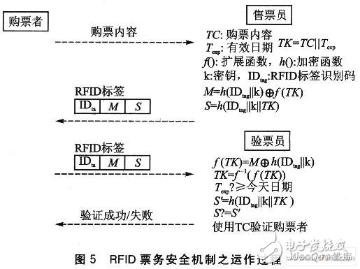 由于RFID与WLAN的无线通信特性,在实际应用中必须考虑可能的安全问题,RFID标签标识符无法覆盖的功能至少可保障每个RFID标签的唯一性,防止使用复制RFID标签方式的安全攻击,因此基本上不用担心RFID门票被违法复制的问题。然而RFID标签内存内容允许读写,如果RFID门票的内容直接以明文方式储存于内存,则恶意攻击者可以很容易分析所读取的内容,并加以修改,然后重新写入RFID标签内存达到安全攻击的目的。因此,使用RFID标签内存存储购票内容时,必须有一套票务安全机制,避免上述安全威胁。本文提出使用单向哈希(hash)函数的票务安全机制,利用RFID标签唯一性,使存储于每个RFID的门票内容数据均不相同,以防止恶意攻击者猜测门票内容。图5说明此RFID票务安全机制运作过程。