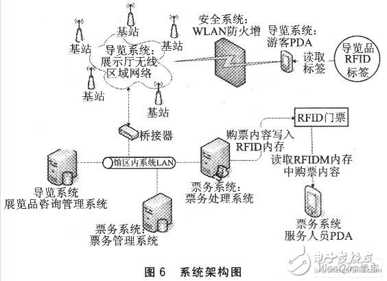基于以上构想,搭建系统以验证架构的可行性。系统所需RFID设备购自Giga—Tms公司。RFID标签内含1KB的只读存储器(EEPROM),RFID读写器则采用CF适配卡形式的读写器插于HP iPAQ 4700 PDA,所采用的RFID设备符合ISO 14443A及MIFARE工业标准,电波频率13.56 MHz,接口传输速率19 200 bps,感应距离约2~3 cm。WLAN部分使用符合IEEE 802.11b标准的Cisco Aironet 350 AP连接至有线网络,有线网络端的导览系统与票务系统服务器使用PC,内建网站伺服程序。在软件设计上,使用C#语言在Pocket PC操作系统利用COM接口通信程序与RFID读写器通信,并利用Web浏览器控件及HTTP通信协议开发导览系统。图6显示本系统设计的系统架构。