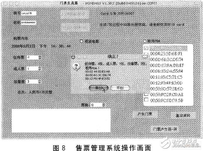 在票务系统方面,于PC上开发售票管理系统,使用连至PC的COM通信端口与RFID读写器建立连接。之后售票管理系统会与票务数据库建立连接,待锁定一张RFID门票后,便从票务数据库中取得门票票价、剩余可售门票信息并进行售票。此外,售票管理系统也兼负导览PDA租用业务。在确认购票内容后,售票管理系统便将售票记录存至票务数据库,并将售票内容依据本文RFID票务安全机制写入RFID门票的内存。另外在负责验票的PDA上设计门票验证程序,该PDA经由CF接口RFID读取器读取RFID门票RFID标签标识符以及2个512位数据,安全机制进行验证。图8显示售票管理系统实际操作画面,图9显示门票验证程序验证RFID门票后在PDA上显示的画面。