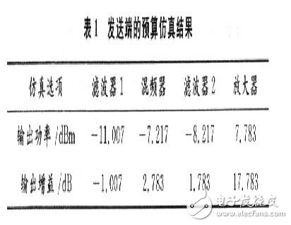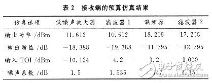 可得,系统总的IIP3=-9.75 dBm。同样在模拟设计环境下,对接收端进行预算仿真,仿真结果如表2所示。