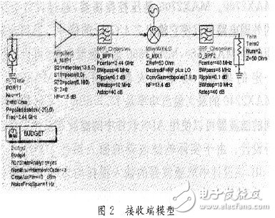 接收端在设计中要考虑增益、噪声系数、灵敏度等因素,比发射端的设计更为复杂。由于接收端包含很多有源器件,有源器件的非线性对整个接收系统会产生很大的影响,比如当只输入一个信号时会出现增益压缩,当输入两个以上的信号时会出现互相调制等。在本设计中,中频解调模块大概也需要8~10 dBm的信号大小,经过分析,低噪声放大器采用的是MAX2641,MAX2641的增益为13.5 dB,噪声系数为1.5 dB。混频器采用的是MAX2682,MAX2682的增益为7.9 dB,噪声系数为13.4 dB,本地振荡器与发送端的相同。使用ADS对接收端进行建模,如图2所示。